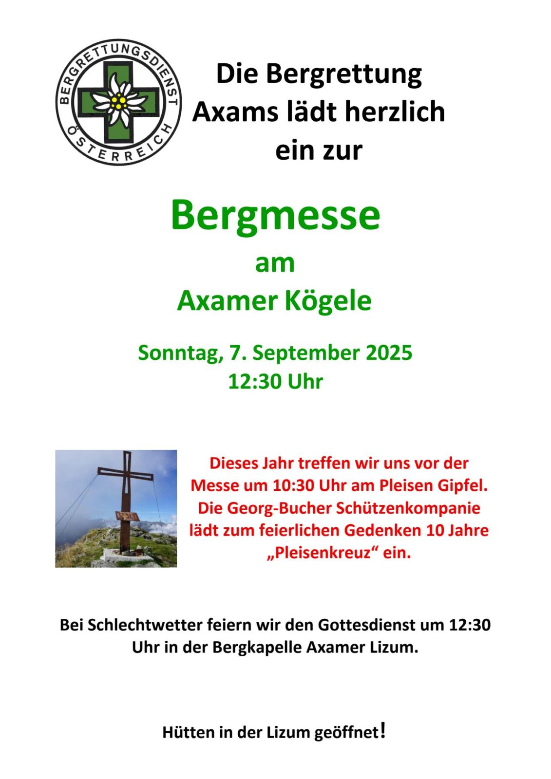 Die Bergrettung Axams lädt euch herzlich zur diesjährigen Bergmesse ein!